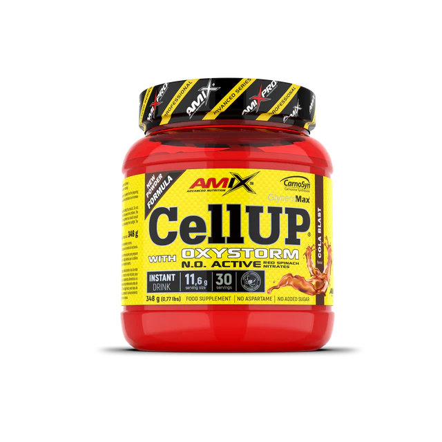 Amix™ CellUp® with Oxystorm® es un complemento alimenticio en polvo, diseñado como un suplemento pre-entreno concentrado. Contiene una combinación de ingredientes activos como CarnoSyn® beta-alanina, taurina, GlyceroMax® (glicerol en polvo), L-arginina HCl, Oxystorm® (extracto de espinaca roja), cafeína anhidra, vitamina C y vitamina B6.